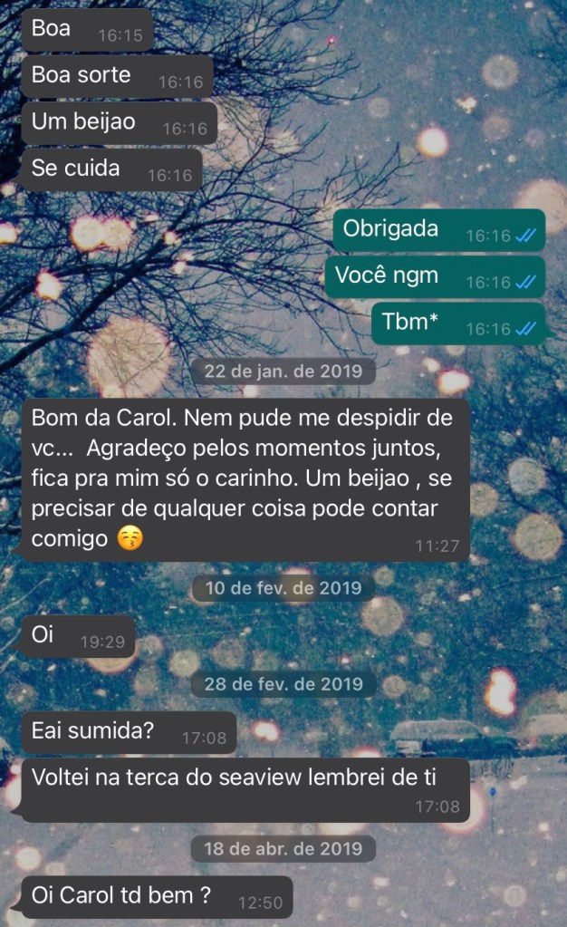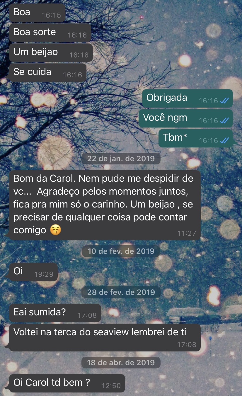 Enfim, terminou o Cruzeiro, voltamos para nossas respectivas casas em São Paulo – coincidentemente ele também mora aqui – e já no dia seguinte me enviou uma mensagem, sugerindo que saíssemos.